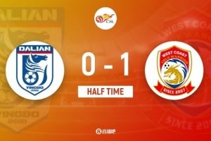 伤停补时4分钟。上半场比赛结束,大连英博0-1青岛西海岸。